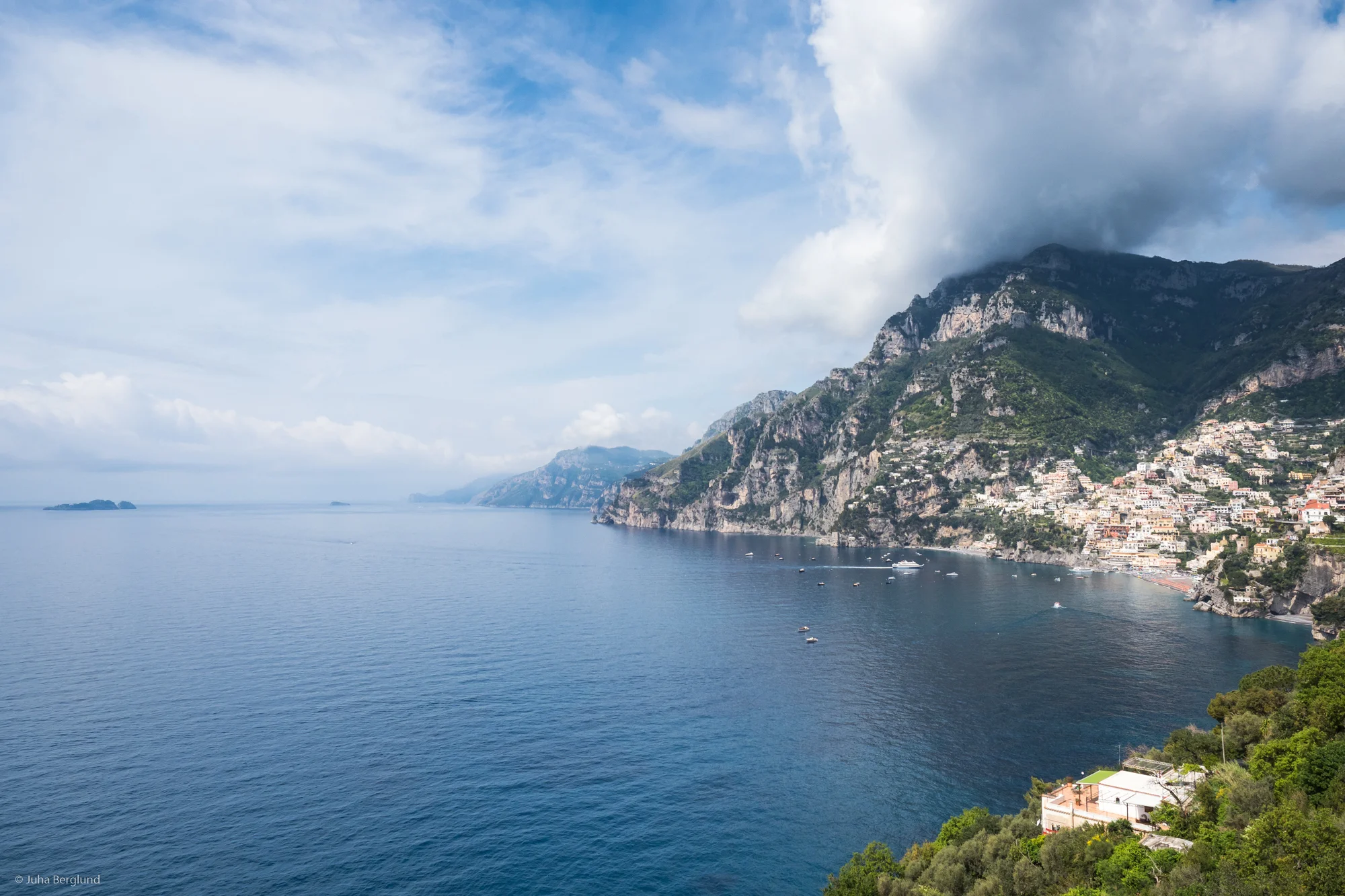 Driving around the Amalfi Coast, another UNESCO World Heritage site. Town of Positano on the right, and the Sirenusas on the background.