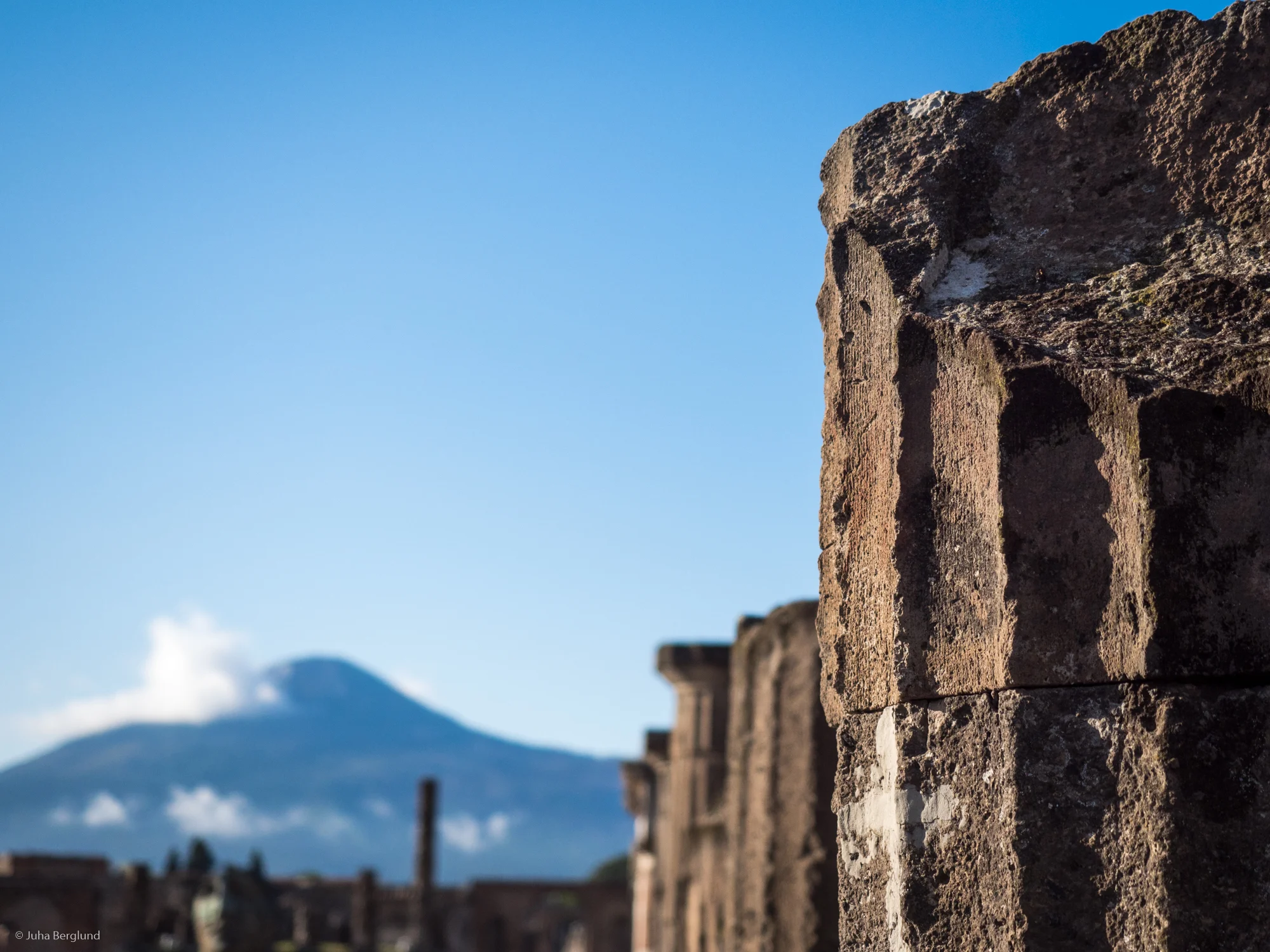Vesuvius looming on the background. For a reason I cannot fathom, Pompeii was recently littered with some pseudo-classic weird looking faux-antique statues made by some Polish dude. Since I wanted to frame them out, the end results look like this picture. Perhaps next year they will open a McDonalds on the Forum.